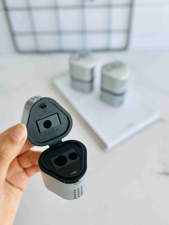 تراش سه قلو فابر کاستل Faber-Castell Grip Trio دارای 3 سوراخ مختلف است که این طراحی 3 دهانه میتواند اندازههای مختلف مداد مانند مدادهای استاندارد، جامبو و مداد رنگی و … را در خود جای دهد.